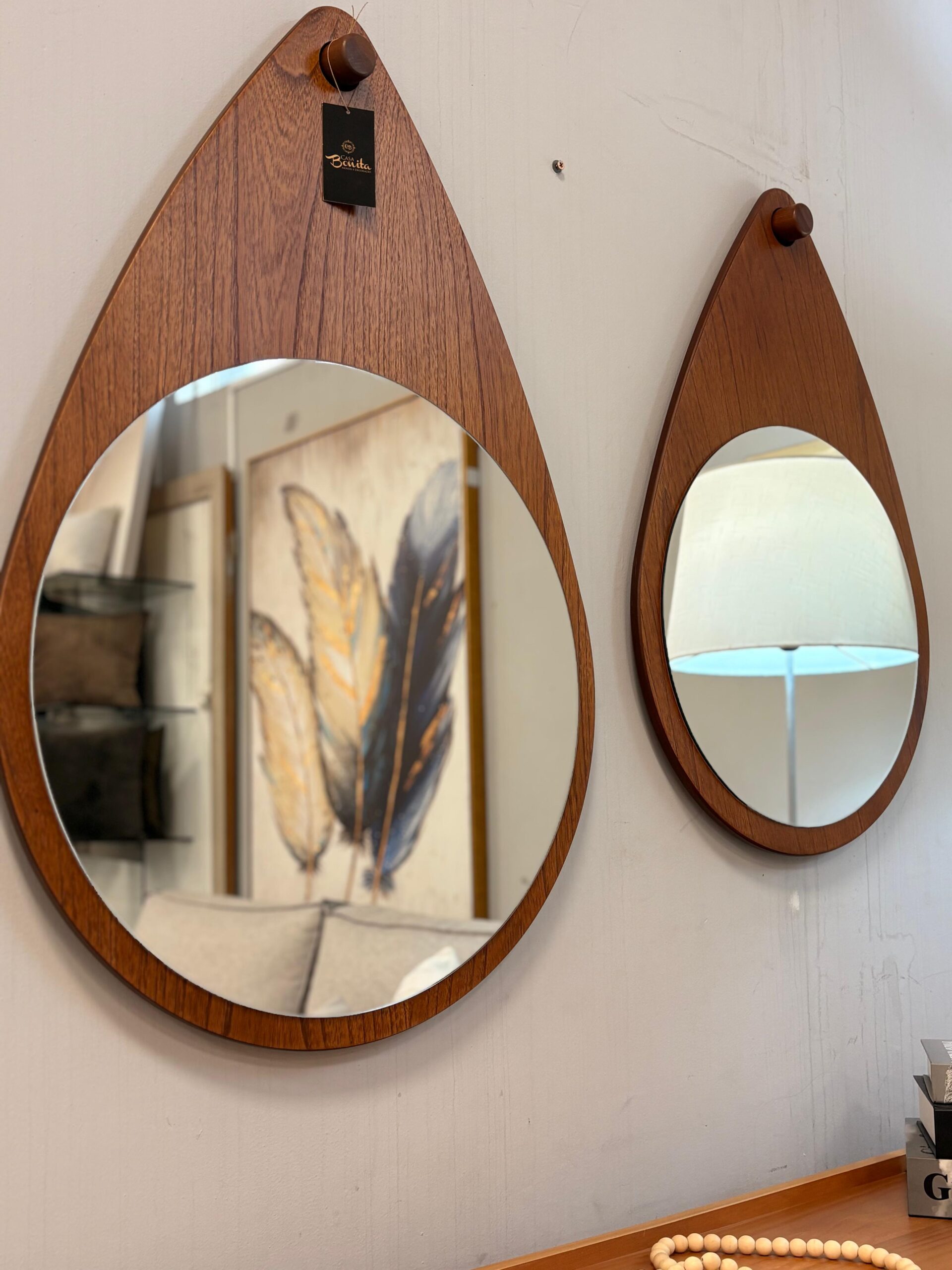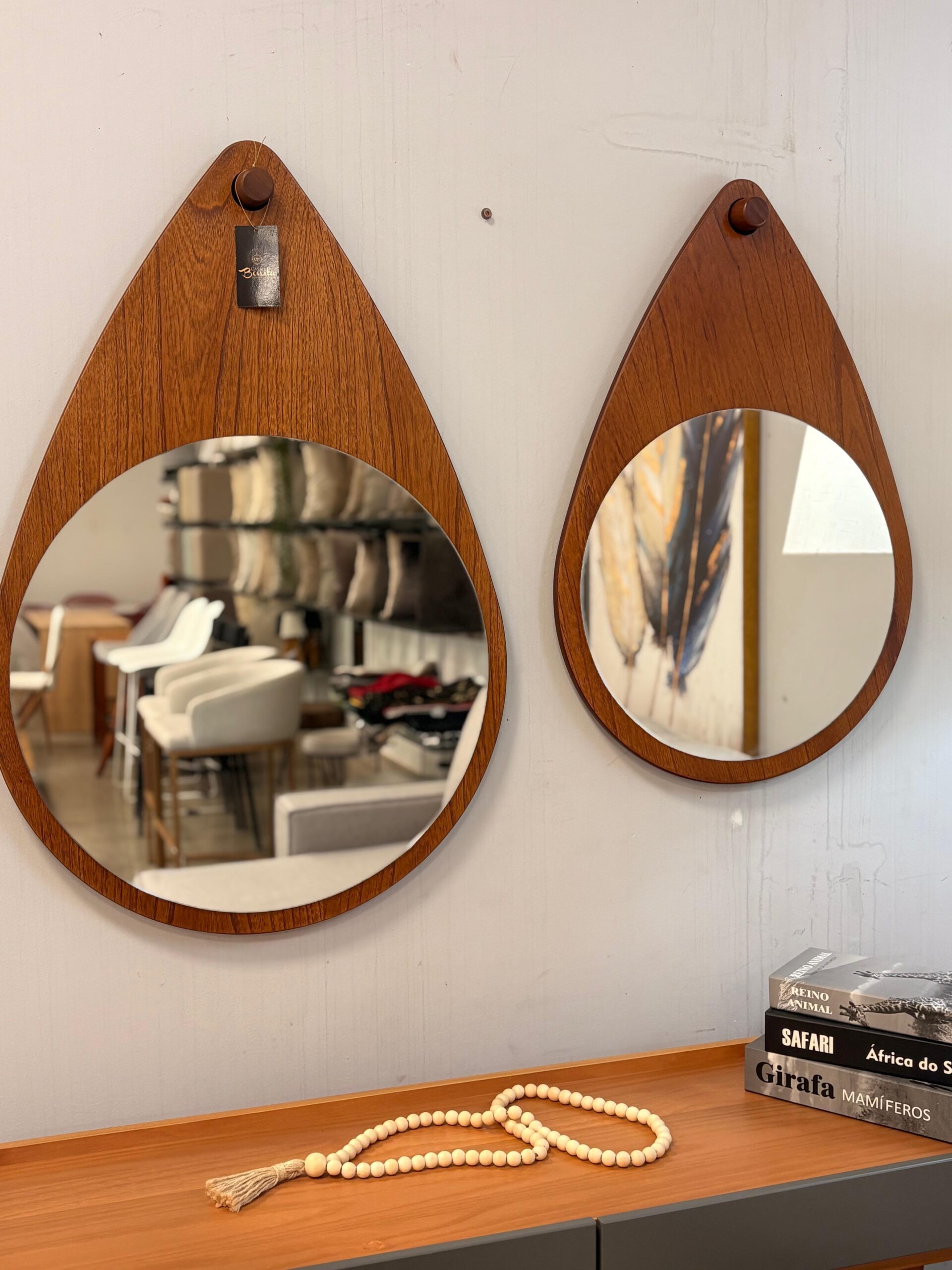 Descrição: Dupla de espelhos em formato de gota com moldura em madeira um toque moderno e orgânico para sua decoração.