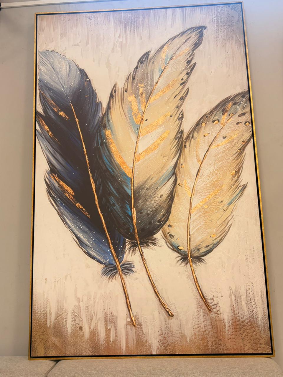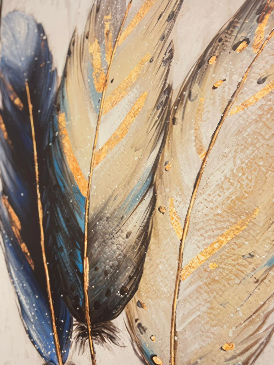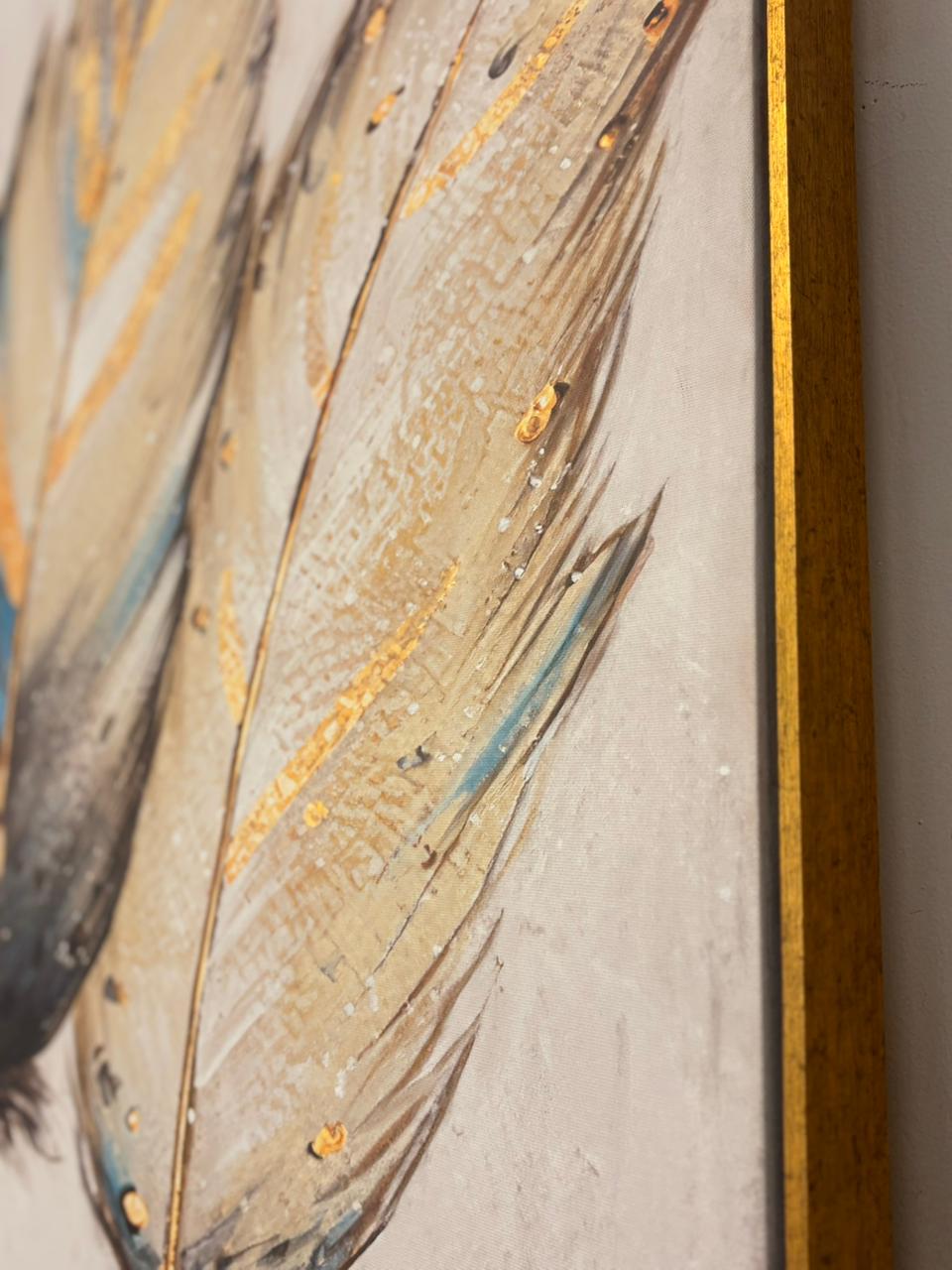 uma composição encantadora em tons neutros com toques de azul, amarelo e dourado. Uma peça que transmite serenidade e sofisticação, perfeita para iluminar o ambiente com elegância e delicadeza.