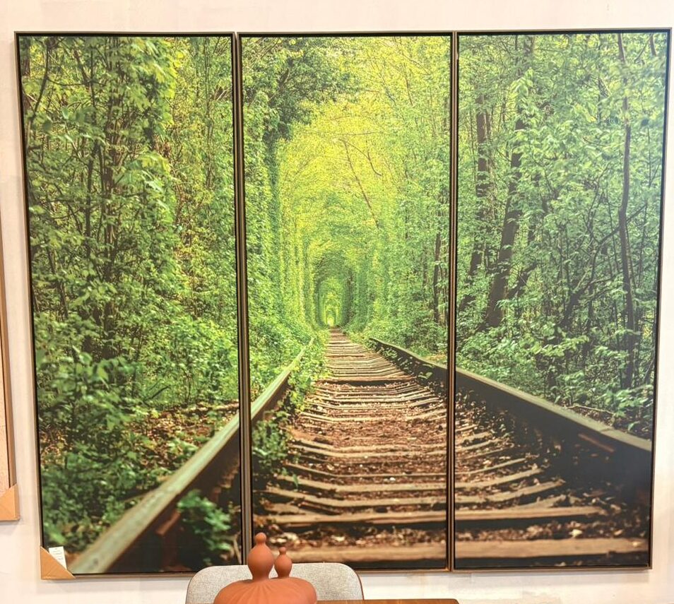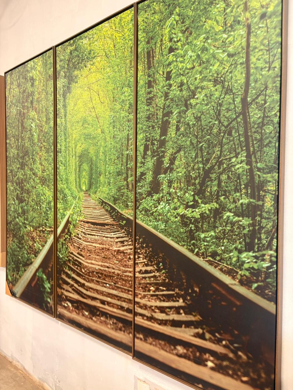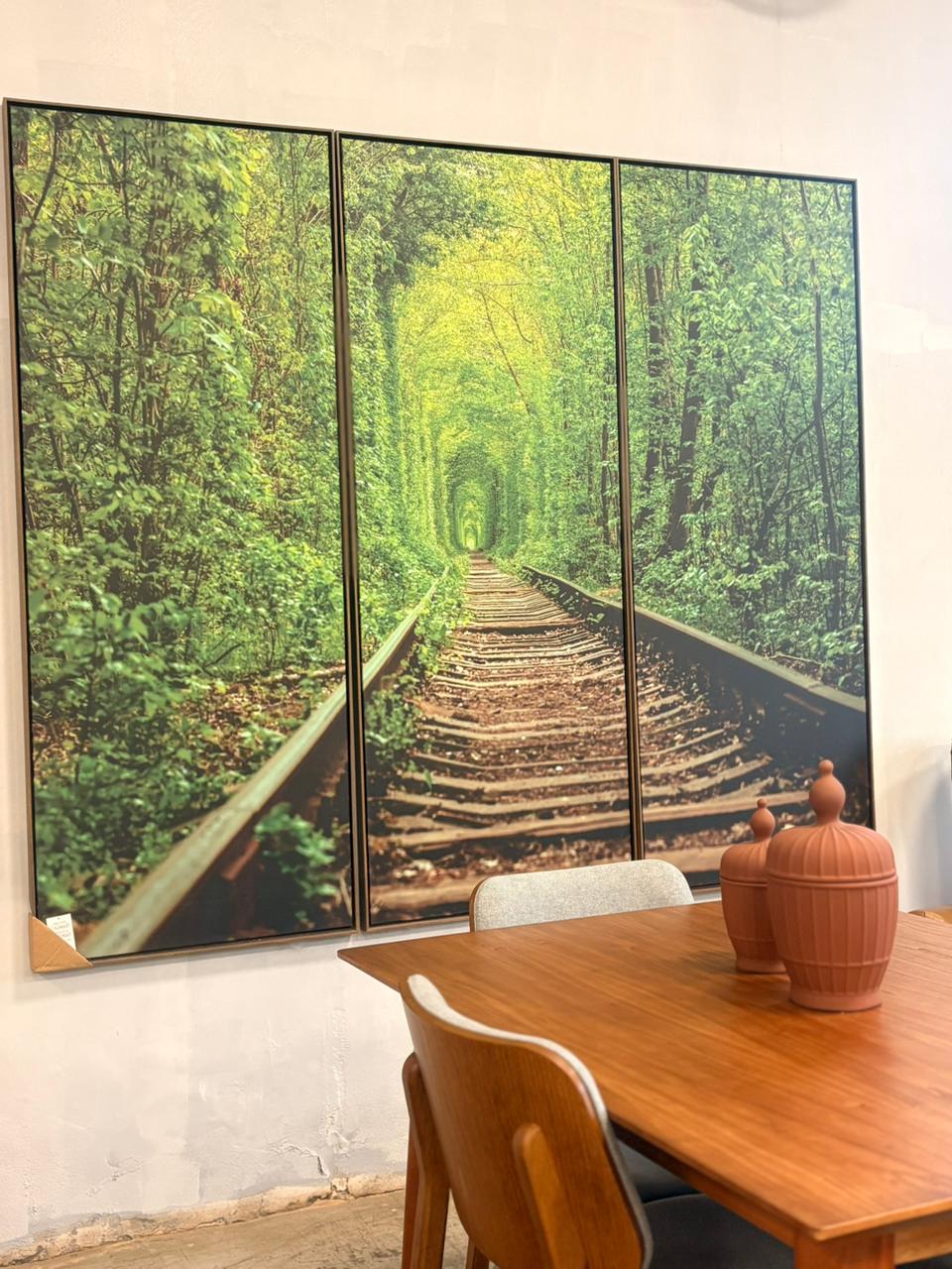 Trio de quadros com paisagem em tons de verde retratando um trilho de trem uma composição que transmite profundidade, tranquilidade e conexão com a natureza. Cada quadro mede 1,70×65, formando juntos uma peça marcante e harmoniosa, perfeita para valorizar ambientes amplos e sofisticados.